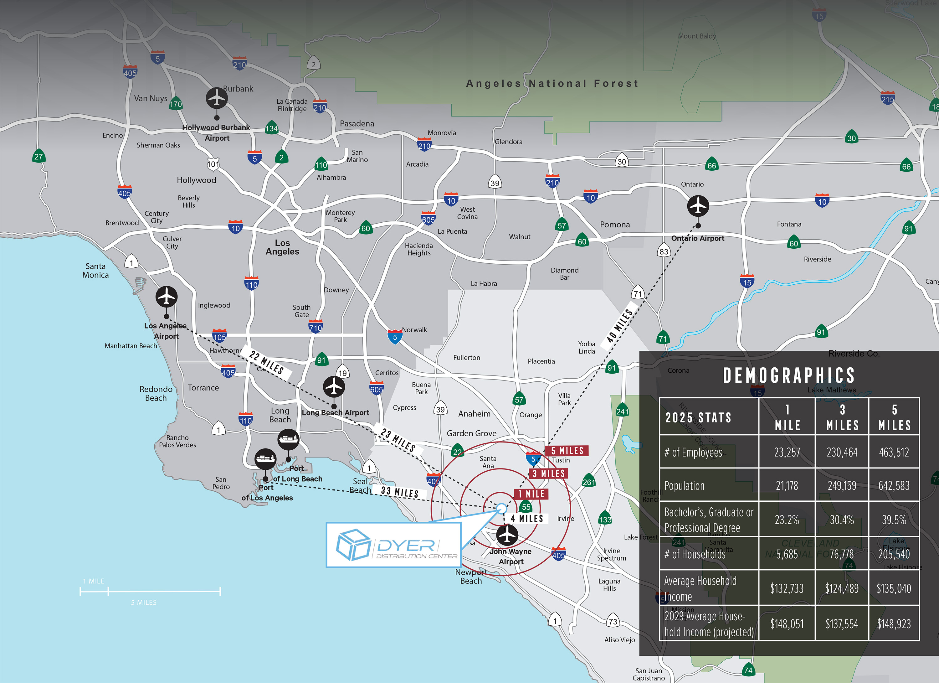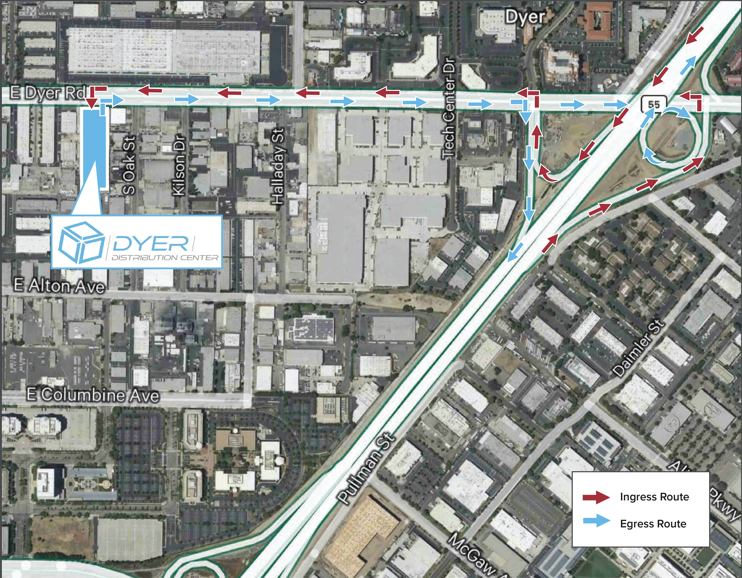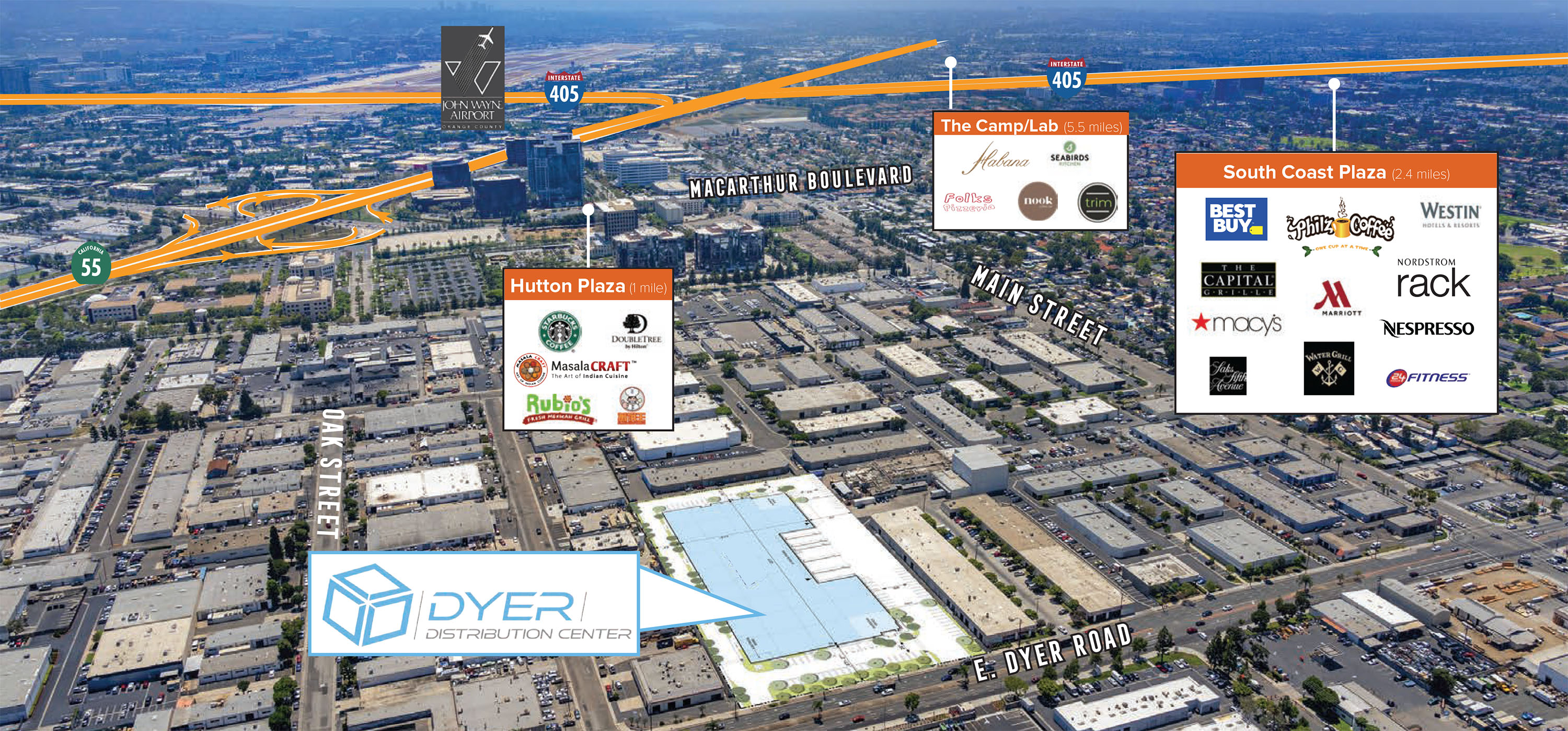 Dyer Distribution Center is located at 300 E. Dyer Road in Santa Ana, California featuring easy access to the Coast Mesa (55), San Diego (405) and Santa Ana (5) freeways.
